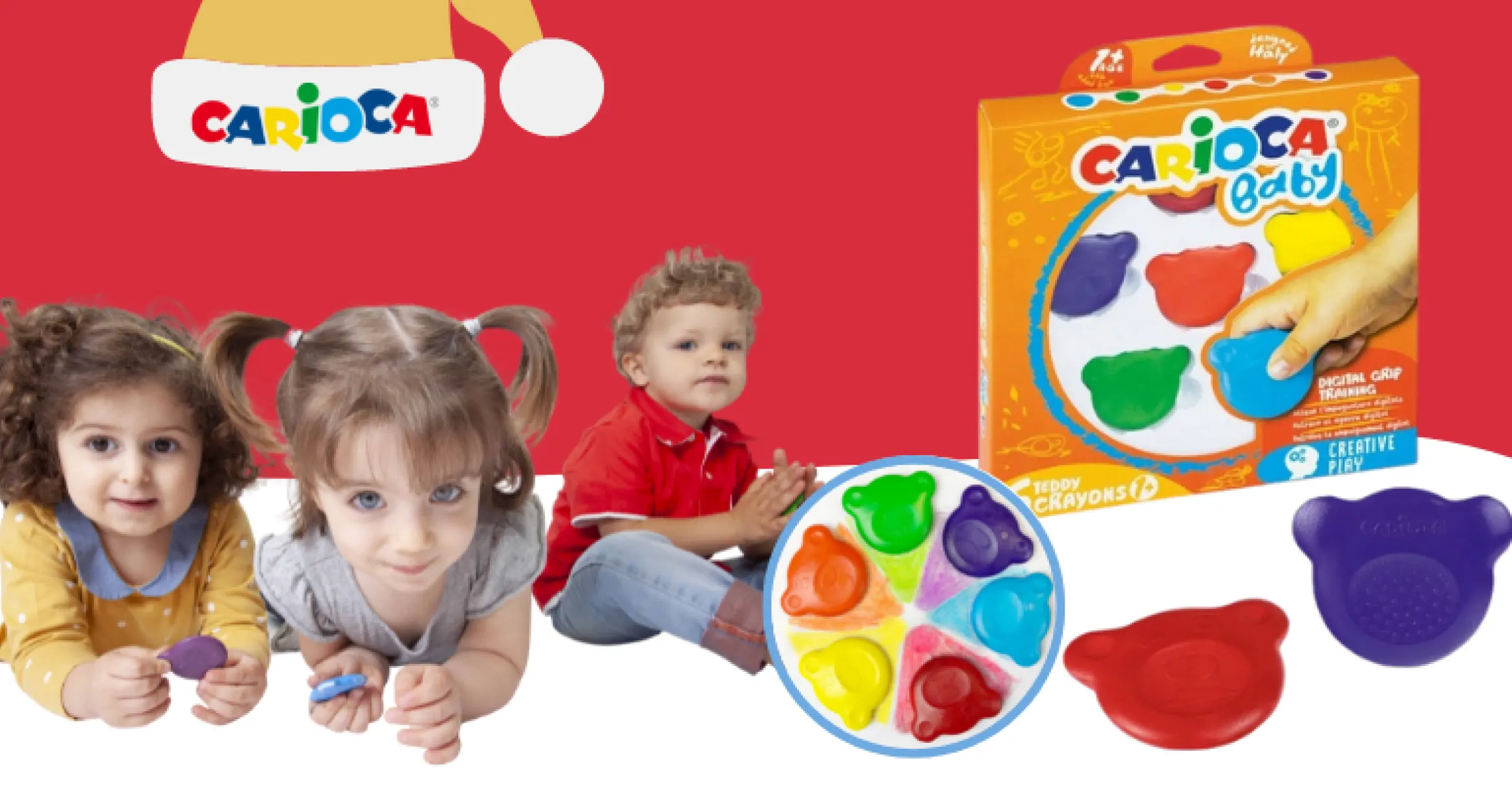 Czy łatwo jest wybrać odpowiednie prezenty dla najmłodszych? Bezpieczne, zdrowe i wspomagające rozwój, a przy tym dające frajdę? Teraz tak: Mikołaj proponuje kredki idealne dla rocznych maluchów. Kredki Misiaki od CARIOCA Baby dzięki specjalnemu kształtowi misia są wygodne dla drobnych łapek maluszka. Specjalne wypustki po jednej stronie kredek ograniczają wyślizgiwanie się ich z paluszków, jednocześnie pobudzając ich wrażliwość dotykową. Dodatkową atrakcją są buźki na kredkach, które pozwolą na zabawę edukacyjną w rozpoznawanie emocji. Zaciekawieni? Kredki dla (już rocznego) maluszka dostępne są w 6 soczystych kolorach.