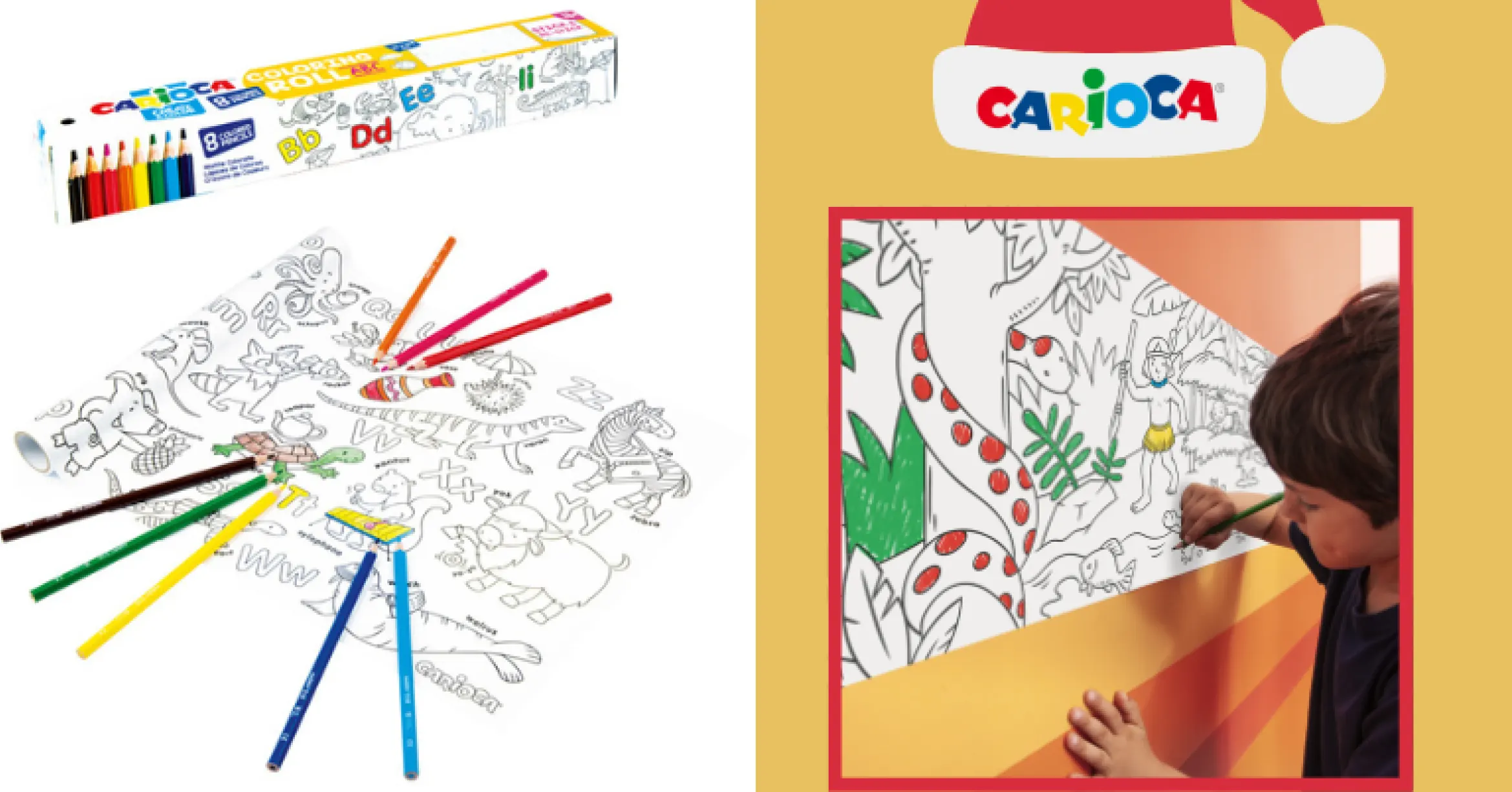 Kolorowanki przechodzą ostatnio swój renesans, ponieważ dzieci mogą dzięki nim ćwiczyć precyzję oraz koncentrację. Na rynku dostępnych jest wiele kolorowanek, ale Mikołaj szczególnie upodobał sobie kolorowanki w rolce CARIOCA, występujące w dwóch rozmiarach: 10×85 cm oraz 30×198 cm. Ich ogromnym atutem jest możliwość przylepienia na ścianie czy szafie, a później usunięcia bez śladu (sprawdźcie najpierw w niewidocznym miejscu). Kolorowanie w takiej pozycji wymusza pozycję pionową, przez co dzieci mogą wzmacniać obręcz barkową. Warstwa klejąca natomiast jest tak opracowana, że nie przywiera mocno do ściany, przez co możemy kolorowankę przyklejać i odklejać wielokrotnie. Do zestawu dołączonych jest też 8 kredek ołówkowych Tita.
