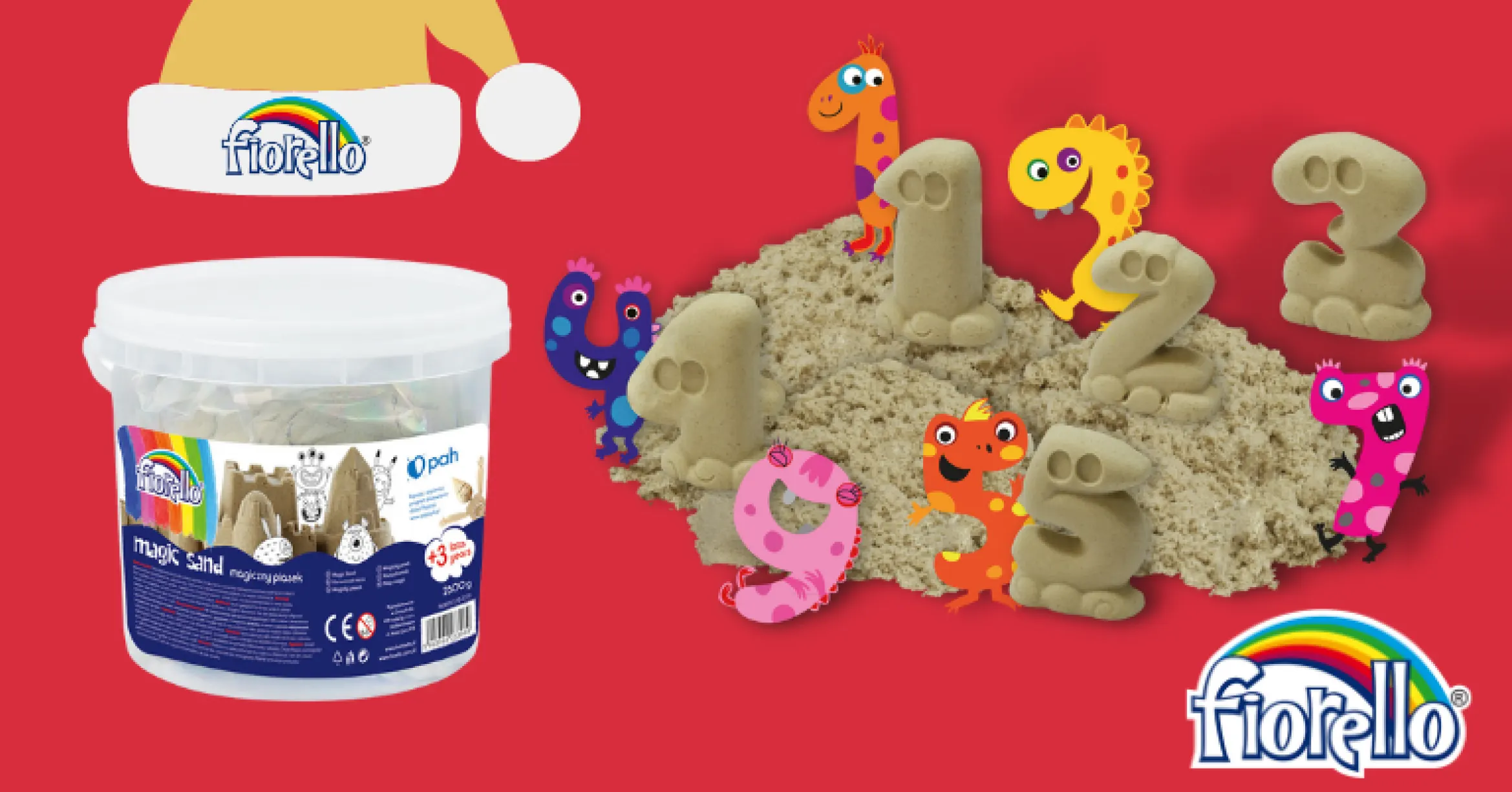 Wszystkim tym, którzy zimą tęsknią za zabawami w piaskownicy, Mikołaj poleca budowanie zamków z piasku w domu! Specjalna, magiczna masa Fiorello o konsystencji nieco podobnej do wilgotnego piasku ma dodatkowe właściwości: ściśnięta w dłoni lub foremce bardzo dobrze trzyma kształt, ale delikatnie rozsypywana przepływa przez palce, dając wrażenie aksamitu. Zestawu mogą używać dzieci już od 3 roku życia.