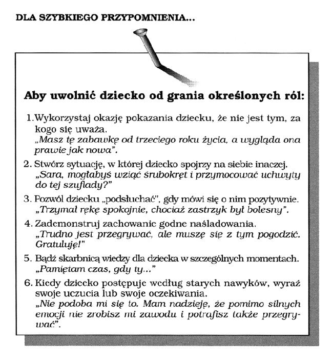 U rodziców często działa wybiórczość spostrzegania. Zwracają uwagę na złe zachowanie dziecka, bo to ich boli, ale równocześnie staje się to dla nich bardzo ważne. Złe zachowanie potęguje się! A słowa działają nieświadomie jak nasiona zasiane w umyśle: nasiona, które wykiełkują i ukształtują w dziecku obraz samego siebie, obraz, który uzna ono za swój i będzie go realizowało. Pamiętajcie, że dobre nasiona dają dobre owoce. To, co mówicie do dziecka, też wyda owoc. Będzie nim to, co dziecko o sobie myśli.
